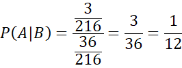 Wypisz wszystkie zdarzenia sprzyjające podanym oraz oblicz ich ilość oraz ilość wszystkich zdarzeń elementarnych. Następnie skorzystaj ze wzoru na prawdopodobieństwo zdarzenia A pod warunkiem, że zaszło zdarzenie B: