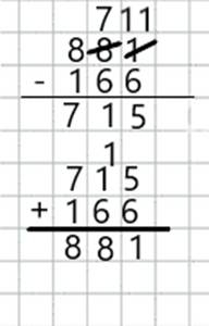 Odejmowanie pisemne polega na odejmowaniu cyfr w jednej kolumnie. Od cyfry leżącej powyżej odejmujemy liczbę leżącą poniżej i zapisujemy wynik pod kreską. Jeżeli liczba powyżej jest za mała, aby odjąć od niej liczbę poniżej, skreślamy liczbę po lewej i zmniejszamy ją o 1, a naszą liczbę powiększamy o 10 i wykonujemy odejmowanie.