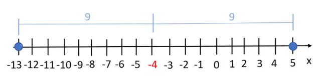 Równanie |x + 4| = 9, możemy zapisać również, jako |x–(–4)| = 9. Wyrażenie |x–(–4)| oznacza odległość szukanej liczby x od liczby –4. Zaznaczamy liczbę –4 na osi liczbowej i szukamy wszystkich liczb x, których odległość od liczby –4 jest równa 9. Szukane liczby to –13 i 5 (sprawdź, podstawiając je do równania w miejsce x). Zatem: