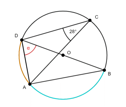 W tym zadaniu skorzystaj z twierdzenia o kątach wpisanym i środkowym, opartych na tym samym łuku, z twierdzenia o kątach wpisanych na tym samym łuku i z definicji kąta wpisanego, który jest oparty na półokręgu. Kolorem żółtym został oznaczony łuk, na którym kąty: |∡DCA| i |∡DBA| są wpisane. Skorzystaj również z definicji o sumie miar kątów w trójkącie.