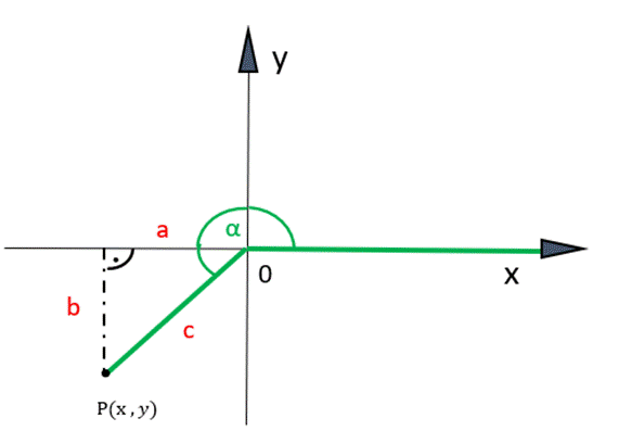 W pierwszym kroku załóż, że kąt α znajduje się w położeniu standardowym, a na drugim ramieniu kąta zaznacz punkt P. Poprowadź linię przerywaną od punktu P, prostopadle do osi OX. Zauważ, że otrzymałeś trójkąt prostokątny, a odległość punktu P od punktu (0,0) stanowi długość przeciwprostokątnej tego trójkąta. Na podstawie wartości cos α, wyznacz długość odcinka b–długość prostopadłej do osi OX, a z twierdzenia Pitagorasa odległość od punktu przecięcia linii z osią OX do punktu początku układu współrzędnych. Zauważ, że punkt P znajduje się w III ćwiartce układu współrzędnych, więc wartość współrzędnej x i y będzie ujemna. Wartość współrzędnej x–określa długość odcinka a, a wartość współrzędnej y–długość odcinka b.