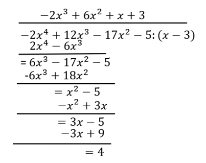 (–2x4 + 12x3–17x2–5) = (x–1)(–2x3 + 6x2 + x + 3) + 4