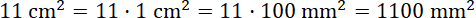 Zauważ, 11 cm2 to jedenaście razy po 1 cm2, więc możesz zamienić 1 cm2 na mm2 (1 cm2 to 100 mm2, bo 1 cm to 10 mm), a otrzymany wynik pomnożyć przez liczbę 11.