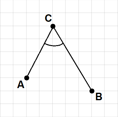Kąt BCA to kąt ostry, którego wierzchołek znajduje się w punkcie C, a ramiona przechodzą przez punkty A i B.