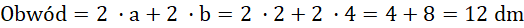 Pole prostokąta obliczasz, mnożąc długości boków figury, a obwód – dodając wszystkie długości boków.