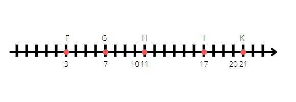 Musisz zaznaczyć na osi liczbowej podane punkty: F = 3, G = 7, H = 11, I = 17, K = 21.