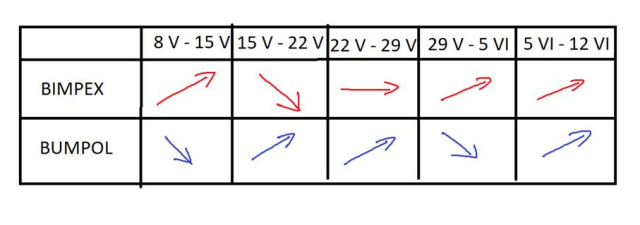 Popatrz na wykres. Okres, w którym cena akcji rośnie, zaznacz strzałką w górę, okres, w którym cena akcji maleje, zaznacz strzałką w dół. Okres, w którym cena się nie zmienia, zaznacz poziomą strzałką.