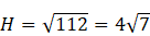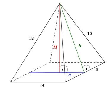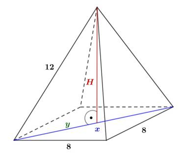 Wysokość ostrosłupa (H) oblicz, konstruując trójkąt prostokąt oraz stosując twierdzenie Pitagorasa, a także związki miarowe w figurach geometrycznych.
