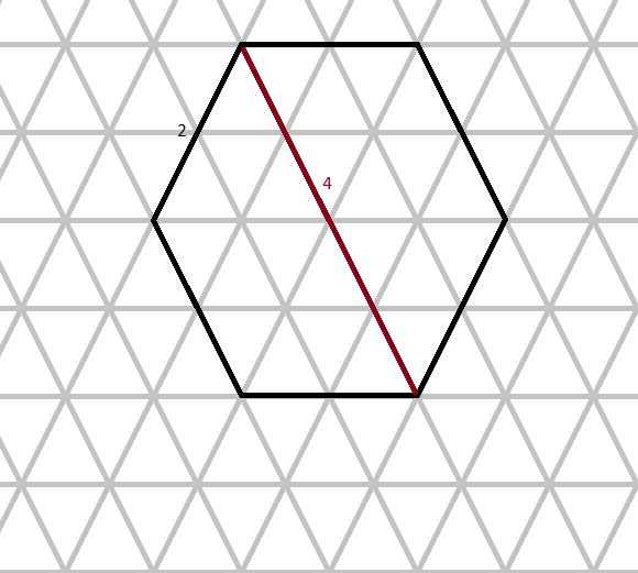 Sześciokąt foremny o boku 2 składa się z 24 trójkątów równobocznych o boku 1. Jego najdłuższa przekątna przechodzi przed środek sześciokąta i ma długość 4.