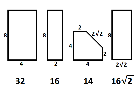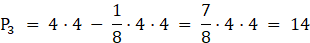Pole figury trzeciej obliczysz licząc pole kwadratu o boku 4 i odejmując od niego tego pola. Jest tak dlatego, że trójkąt prostokątny wycięty z tego kwadratu zmieściłby się w nim dokładnie 8 razy – jest połową kwadratu o boku 2.