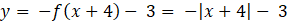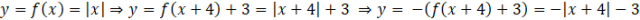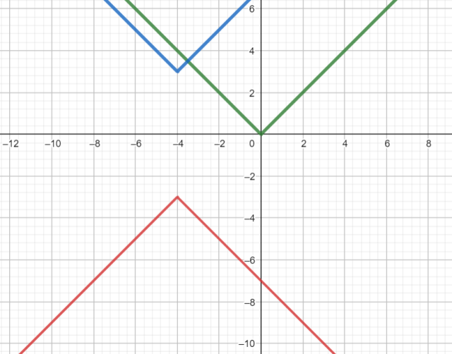 Na początku naszkicuj wykres funkcji y = |x| – kolor zielony. Następnie przesuń otrzymany wykres o wektor [-4, 3] – kolor niebieski. Później odbij symetrycznie wykres względem osi OX – kolor czerwony. Przekształcenia wzoru funkcji wykonaj w następujący sposób: