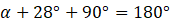 α jest jednym z kątów wewnętrznych trójkąta, którego jeden kat jest oparty na średnicy okręgu, więc jest kątem prostym, a drugi jest oparty na tym samym łuku co kąt 28°, więc ma także taką samą miarę.
