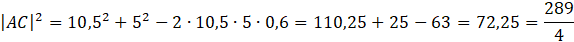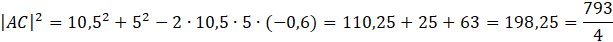 W tym zdaniu musisz obliczyć długość boku AC, korzystając z twierdzenia cosinusów.