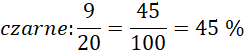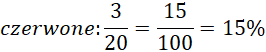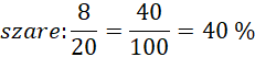 Zapisz ułamek. Mianownik to liczba wszystkich koralików, a licznik to liczba koralików w danym kolorze. Następnie rozszerz ułamek do mianownika 100 i zamień na procenty.