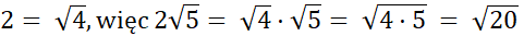 Zapisz liczbę całkowitą jako pierwiastek i zastosuj zasadę mnożenia pierwiastków. Jeśli mnożymy lub dzielimy dwa pierwiastki jednakowych stopni, to możemy zapisać je pod jednym pierwiastkiem.