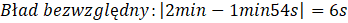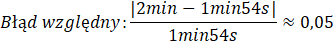 Podaj wartość błędu względnego oraz błędu bezwzględnego przybliżenia przebiegnięcia pewnego dystansu w czasie 1 min 54 sek. i oszacowania, że trwał on 2 minuty.