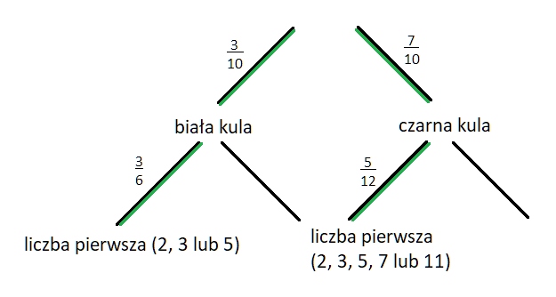Ponieważ doświadczenie losowe jest wieloetapowe, w tym zadaniu musisz narysować drzewko. Pierwszy poziom drzewka będzie odpowiadał losowaniu kuli, zaś drugi – rzutowi kostką. Możesz wylosować kulę białą lub czarną, zaś rzucając kostką sześcienną możesz wyrzucić trzy liczby pierwsze (2, 3 lub 5), albo pozostałe liczby z kolei przy rzucie kostką dwunastościenną możesz otrzymać 5 liczb pierwszych (2, 3, 5, 7, 11) i te wszystkie przypadki zaznaczasz jako gałęzie. Zarówno prawdopodobieństwo wylosowania danej kuli jaki i wyrzucenia danej liczby oczek obliczasz z klasycznej definicji prawdopodobieństwa dzieląc ilość konkretnych kul lub liczb na kostce przez wszystkie kule bądź liczby jakie są. Gdy już narysujesz drzewo zaznacz te zdarzenia, których prawdopodobieństwo będziesz liczył oraz wszystkie gałęzie po drodze. Następnie przemnóż przez siebie prawdopodobieństwa na poszczególnych gałęziach oraz dodaj do siebie uzyskane wyniki z różnych gałęzi.