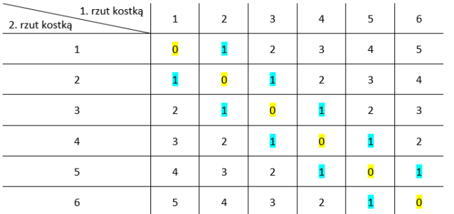 A – wyrzucono dwie takie same liczby oczek na obu kostkach (a więc różnica między ilościami oczek wynosi 0) (zaznaczone kolorem żółtym)
