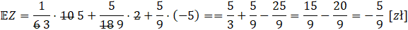W tym zadaniu trzeba wyliczyć wartość oczekiwaną wyniku gry polegającej na rzucie dwiema kostkami do gry. Wyrzucenie tej samej ilości oczek na obu daje wygraną w wysokości 10 zł, jeśli różnica między liczbą oczek będzie wynosiła 1 to wygrana wynosi 2 zł, zaś w przeciwnym wypadku strata wynosi 5 zł.