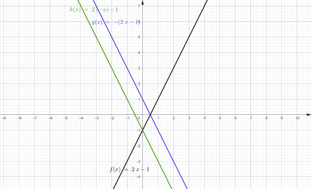 Narysuj wykres funkcji f(x) = 2x - 1, a później narysuj wykresy funkcji g(x) = -f(x) oraz h(x) = f(-x) w tym samym układzie współrzędnym.
