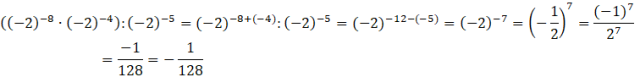 W tym zadaniu musisz obliczyć wartość wyrażenia ((-2)-8 ∙ (-2)-4) : (-2)-5 i zapisać prawa działań na potęgach, z których skorzystałeś.