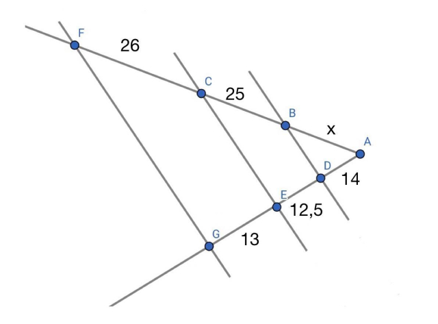 Twierdzenie Talesa mówi, że jeśli przetniemy ramiona kąta prostymi równoległymi względem siebie, to stosunki odpowiednich otrzymanych odcinków będą równe. Przykładowymi stosunkami są te użyte do rozwiązania tego zadania. Stosunek długości odcinka od wierzchołka kąta do pierwszej prostej do odcinka między prostymi na tym samym ramieniu kąta jest równy takiemu samemu stosunkowi na przeciwnym ramieniu. W ten sposób otrzymujemy równanie, z którego w prosty sposób można wyliczyć szukany odcinek.