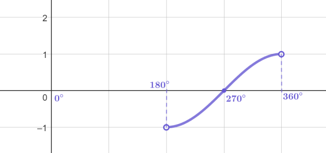 Dany jest kąt α ∈ (180°; 360°). Narysuj wykres funkcji y = cos α z uwzględnieniem podanej dziedziny. Podaj jej miejsca zerowe oraz wartość minimalną i maksymalną.