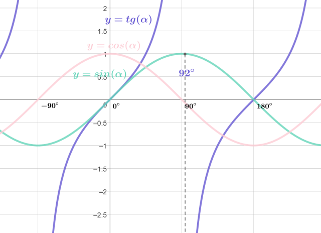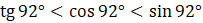 Dane są wyrażenia: sin 92°, cos 92° oraz tg 92°. Uporządkuj ich wartości rosnąco. W tym celu skorzystaj z sinusoidy, cosinusoidy i tangensoidy.