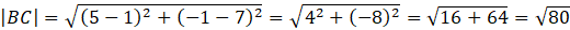 Wykorzystaj wzór na odległość między punktami w układzie współrzędnych do obliczenia długości boków trójkąta ABC: