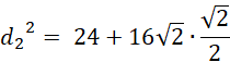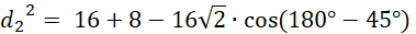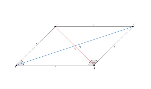 Skorzystaj z własności kątów w równoległoboku, by obliczyć miarę kąta lezącego naprzeciwko drugiej przekątnej – d2