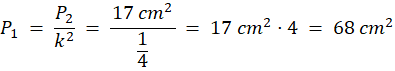 Wyznacz pole powierzchni trójkąt T1, wiedząc, że trójkąt T2 o polu P2 = 17 cm2 jest podobny do niego w skali k =