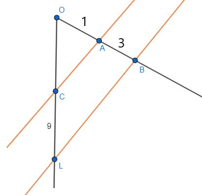 Przyjmij oznaczenia jak na rysunku powyżej. Skorzystaj z twierdzenia Talesa i wyznacz długość odcinka CL. Następnie wyznacz długość odcinka LO jako sumę długości odcinków OC i CL.