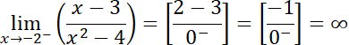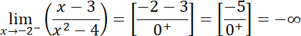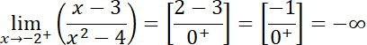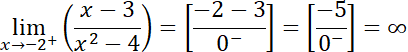 Zacznij od badania dziedziny funkcji, sprawdź, czy istnieją jakieś punkty, w których funkcja nie przyjmuje wartości (tzn. jest w nich nieciągła). Występowanie asymptot pionowych badasz poprzez sprawdzanie granic przy x dążącym do punktu nieciągłości z prawej i lewej strony. Są to punkty x = -2 i x=2. Po podstawieniu w granicach wartości nieco większych i nieco mniejszych niż -2 i 2 otrzymasz odpowiednio nieskończoność oraz minus nieskończoność i minus nieskończoność i nieskończoność dla drugiego punktu. Są to granice niewłaściwe. Stąd wniosek, że w punkcie