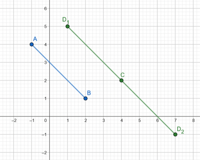 Znajdź współrzędne punktu D tak, aby odcinki AB i CD były równoległe oraz miały równe długości, jeśli A(-1,4), B(2,1), C(4,2).