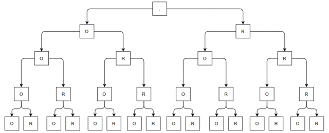 Narysuj w postaci drzewa zbiór wszystkich wyników doświadczenia polegającego na czterokrotnym rzucie monetą.