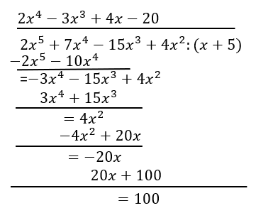 (2x5 + 7x4–15x3 + 4x2) = (x + 5)(2x4–3x3 + 4x–20) + 100
