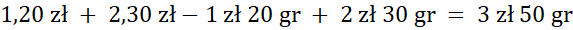 Najpierw oblicz kwotę jaką zapłaciła Iza. Następnie oblicz różnicę przekazanego pieniądza i wartości zakupów. Jeżeli część ułamkowa odjemnej jest liczbą mniejszą od część ułamkowej odjemnika, to jedną część całości możesz przekształcić na część ułamkową. W tym przypadku jedną złotówkę zamienisz na 100 groszy.