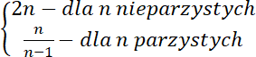 W przypadku wyrazu o numerze nieparzystym jego wartość wyznaczamy z pierwszego równania, w przypadku wyrazów o numerach parzystych jego wartość wyznaczamy z równania drugiego. Po podstawieniu kolejno liczb od 1 do 6 w miejsce n otrzymujemy wartość danego wyrazu ciągu.