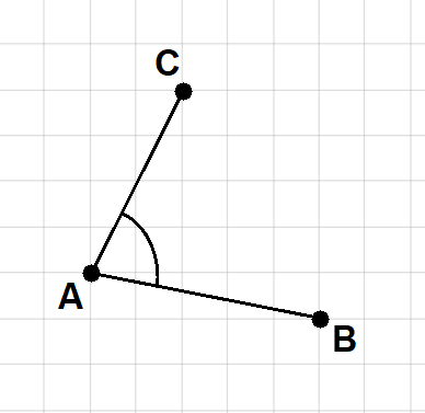Kąt CAB to kąt ostry, którego wierzchołek znajduje się w punkcie A, a ramiona przechodzą przez punkty C i B.