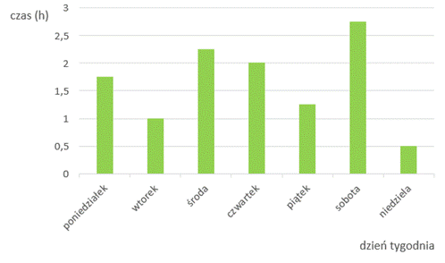 Narysuj diagram słupkowy i oblicz liczbę godzin słuchania muzyki przez Magdę w ciągu tego tygodnia.