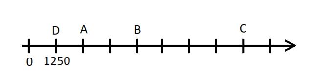 W tym zadaniu musisz zaznaczyć na osi o odpowiedniej jednostce podane liczby: A = 2500, B = 5000, C = 10 000, D = 1250.
