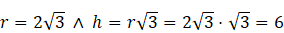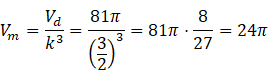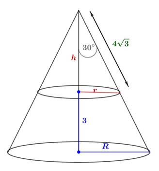 Skalę podobieństwa dużego stożka do małego oblicz jako stosunek wysokości większego z nich (H) do małego (h) – obie wysokości wykorzystując własności trójkąta szczególnego (30°, 60°, 90°). Następnie oblicz objętość Vd, wiedząc, że stosunek objętości tych brył jest równy skali do sześcianu, czyli k3.