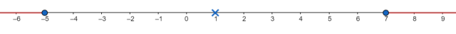 Aby rozwiązać nierówność, na początku skorzystaj z własności |a| = |-a| (|1 – x| = |-(1 - x)| = |x - 1|). Następnie zaznacz na osi wszystkie te punkty, których odległość od 1 jest większa lub równa 6.