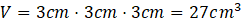Oblicz objętość pokazanego na rysunku prostopadłościanu o wymiarach 3 cm x 3 cm x 3 cm.