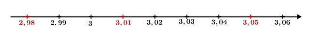Liczby 2,98; 3,01; 3,05 różnią się wielokrotnością 0,01, zatem na osi liczbowej zaznacz odcinki odpowiadające 0,01 jednostkom.