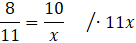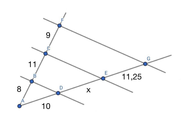 Twierdzenie Talesa mówi, że jeśli przetniemy ramiona kąta prostymi równoległymi względem siebie, to stosunki odpowiednich otrzymanych odcinków będą równe. Przykładowymi stosunkami są te użyte do rozwiązania tego zadania. Stosunek długości odcinka od wierzchołka kąta do pierwszej prostej do odcinka między prostymi na tym samym ramieniu kąta jest równy takiemu samemu stosunkowi na przeciwnym ramieniu. W ten sposób otrzymujemy równanie, z którego w prosty sposób można wyliczyć szukany odcinek.
