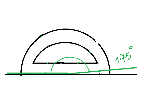 Najpierw narysuj poziomy odcinek, używając linijki. Następnie przyłóż środek kątomierza, często oznaczany dziurką lub krzyżykiem, do prawego końca odcinka. Następnie znajdź oznaczenie 175º na kątomierzu (zazwyczaj wartości podawane są co 10º, więc kąt 175º będzie się znajdował dokładnie pomiędzy 170º, a 180º) i zaznacz punkt na zewnątrz kątomierza. Następnie za pomocą linijki połącz prawy koniec odcinka z zaznaczonym punktem. Na koniec nie zapomnij zaznaczyć łukiem kąta rozwartego.