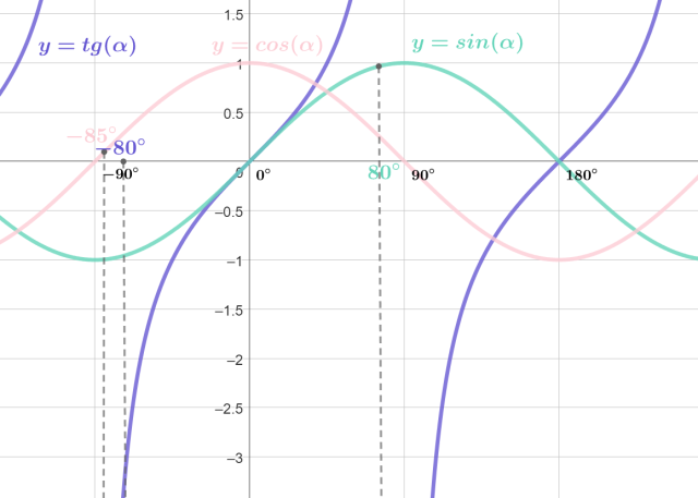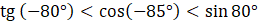 Dane są wyrażenia: sin 80°, cos(-85°) oraz tg(-80°). Uporządkuj ich wartości rosnąco. W tym celu skorzystaj z sinusoidy, cosinusoidy i tangensoidy.
