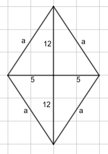 Zauważ, że przekątne rombu razem z bokami tworzą cztery przystające trójkąty prostokątne. Skorzystaj z twierdzenia Pitagorasa w jednym z nich, aby obliczyć długość boku rombu i ustal, czy jest on opisany liczbą wymierną.