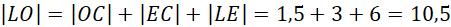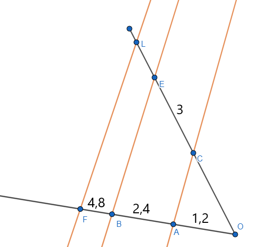 Przyjmij oznaczenia jak na rysunku powyżej. Skorzystaj z twierdzenia Talesa i wyznacz długość odcinka OC i kolejno długość odcinka EL. Oblicz długość odcinka LO jako sumę długości odcinków OC, EC i LE.